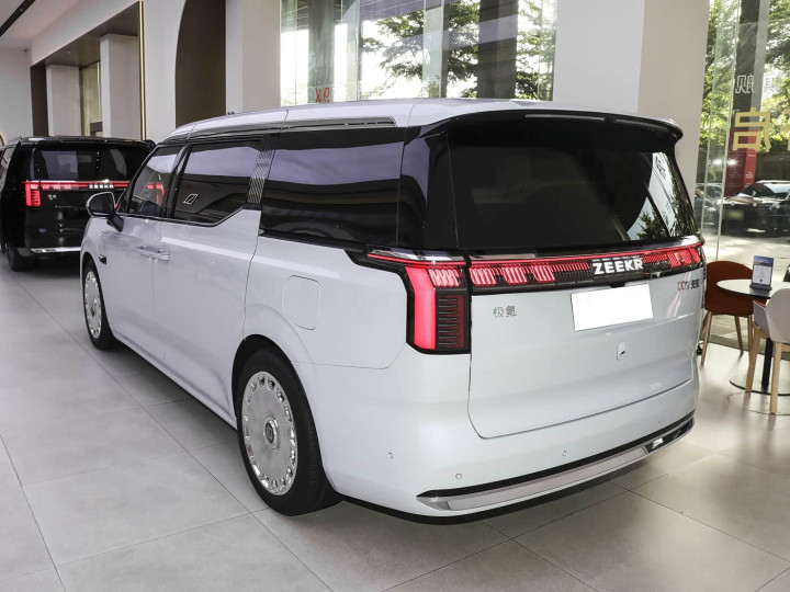 再来看车尾部分,车尾设计与车头形成完美视觉闭环,核心亮点是“光之翼”贯穿式尾灯组,内部光源采用密集列队式排列,边缘黑化处理增强时尚感,中间可点亮的“ZEEKR”品牌标识进一步提升辨识度。车顶扰流板的加入不仅优化了空气动力学性能,更让车尾线条更具层次感。后包围采用与车身同色设计,搭配贯穿式镀铬装饰条,有效拉伸了车尾视觉宽度,弱化了MPV的厚重感。取消传统鲨鱼鳍天线,将其功能集成至尾翼处,让车尾整体性更强。